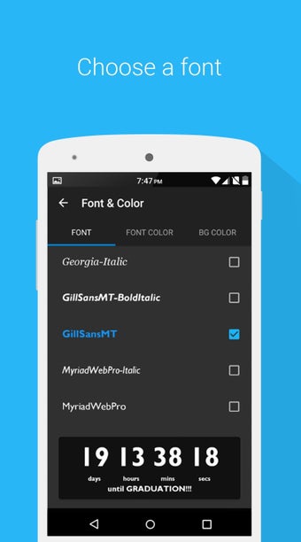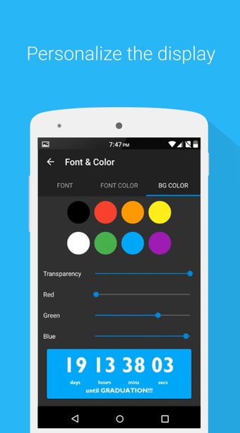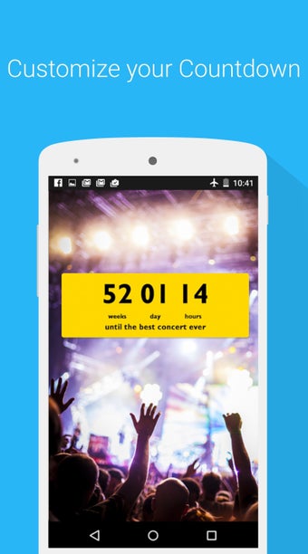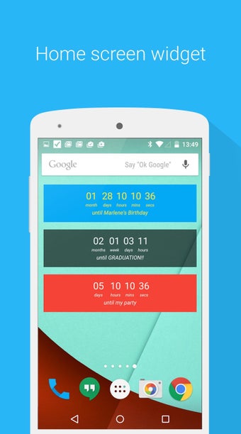 ¡Ya puedes hacer la cuenta atrás para tus eventos con Countdown Widget! Esta práctica aplicación te mostrará la hora exacta de cualquier tipo de evento, como un cumpleaños, un aniversario o un día festivo. Es muy fácil de usar, incluso si no tienes ni idea de cómo hacer una cuenta atrás. Sólo tienes que instalar esta aplicación, establecer el evento y ¡listo! Puedes configurar las unidades de la cuenta atrás, como años, meses, días, horas, minutos o segundos. Incluso hay una opción de cuenta atrás para tu aniversario. Puedes configurar el estilo de la cuenta atrás como quieras.
